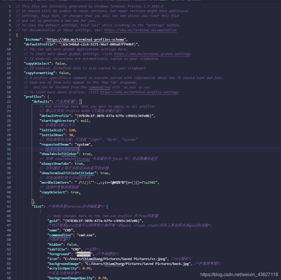 "backgroundImage": "C:/Users/ChiamZhang/Pictures/Saved Pictures/back.jpg", /*终端背景图*/