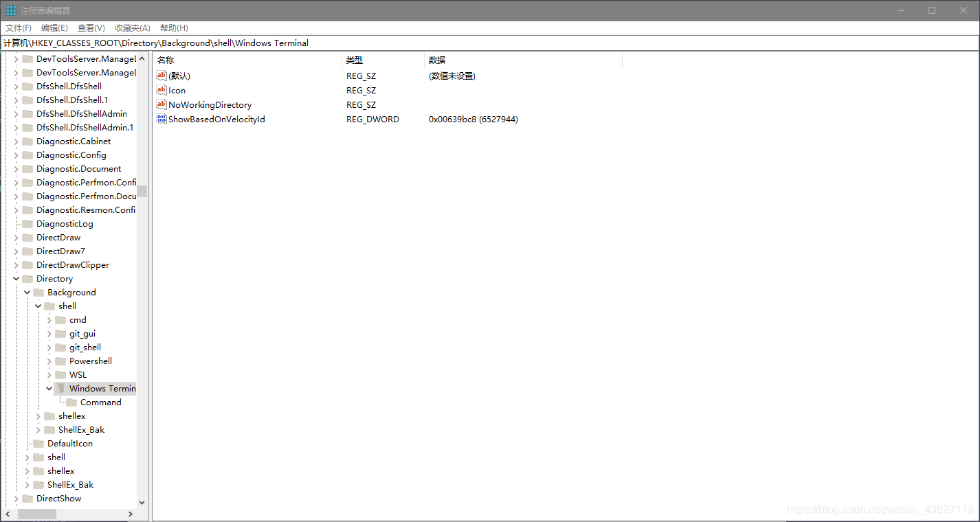 Extended 字符串 #这个值作用是仅支持在按住Shift+右键的时候才显示Windows Terminal选项,删掉则可以不用按住Shift也可以显示Windows Terminal选项